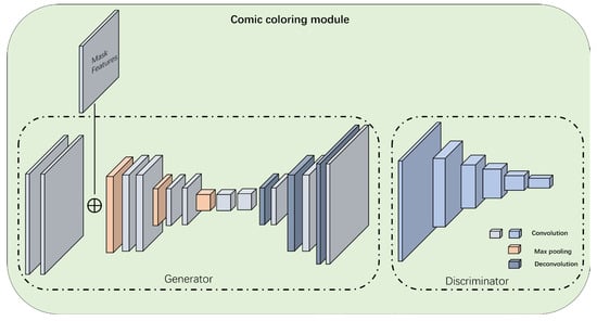 Comic coloring is an essential part of the comic project. Here, we designed a GAN-based coloring network module, as shown in Figure 4. In this network module, the U-Net structure is used as the generator for comic image coloring. In addition, the comic mask features extracted in the comic extraction module are introduced into the generator to reduce the amount of calculation while enhancing the feature generation performance. In the discriminator, we use patchgan. The generated colored image is represented as multiple patches, and the multi-receptive field method is used for discrimination, which enhances the attention to image details and improves the discriminator’s discrimination ability.