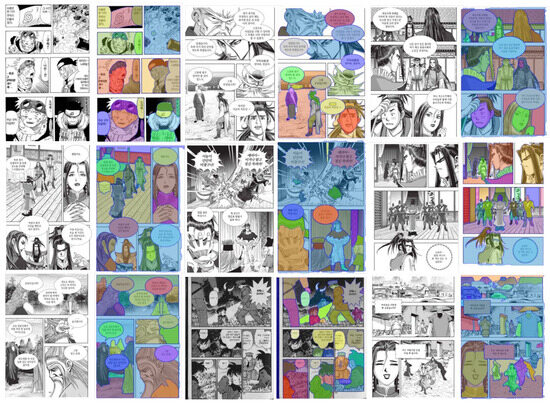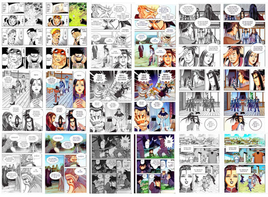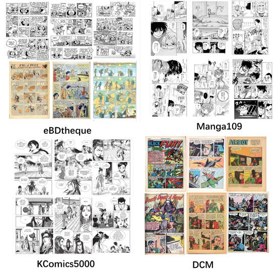 In the selection of datasets, we selected the commonly used eBDtheque [29], Manga109 [30], and DCM [31], and created a dataset based on Korean comics, KComic5000. Samples of the dataset are shown in Figure 5.