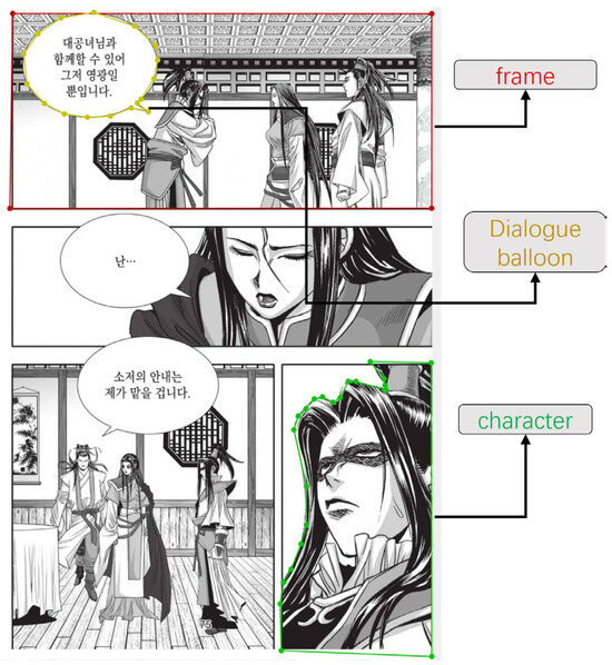 During the pre-training period, it is necessary to pre-process the comic. As shown in Figure 6, we label the frames (boxes), dialogue bubbles, and characters appearing on the comic page. The size of the comic page image is different from the general image size. Here, we use the standard 840 × 640 for a single-page image, which is convenient for model training later; 80% of the dataset is randomly selected for model training and 20% is used for model testing. All experiments are trained and tested on a server PC equipped with an NVIDIA RTX3090 GPU (NVIDIA Corporation, Santa Clara, CA, USA), an AMD Threadripper 2950x CPU (Advanced Micro Devices, Inc., Santa Clara, CA, USA), and 64 G RAM.