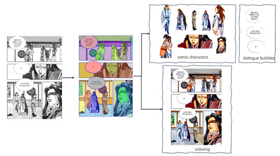 Comics are a complex document type that integrates images and text. The analysis, recognition, and extraction of their internal components is an interesting and challenging task. Usually, comics consist of multiple pages with mixed-layout features composed of multiple layouts. Each page basically contains multiple content boxes, each of which contains dialog boxes, characters, scenes, and other content comprising different shapes. In some comics, the characters or dialog elements in the content box will overflow the content box and penetrate the gap between panels, called the “gutters”. This free-form document layout of comics brings great difficulty to intelligent recognition and extraction tasks. Traditional comic segmentation technology uses basic features such as image edges, colors, and textures to segment elements in comic pages. Usually, the input image is grayed and binarized, and edge detection algorithms (such as Sobel and Canny) are used to detect the edges of dialog boxes, frames, and characters. Contour tracking or Hough transform are used to determine the position of the frames. The positions of dialog boxes, characters, and other graphic elements are determined based on the geometric shape of the contours. Although these traditional methods can segment comics with regular frames to a certain extent, they have poor effects on complex and irregular comic pages, are easily affected by noise or complex backgrounds, and cannot accurately detect and segment the diverse elements in comics, such as the characters, dialogue bubbles, and other elements in each frame of the comics. With the development of artificial intelligence and the widespread application of convolutional networks [1], more and more researchers have begun to try to use deep learning methods to process comics. Among them, Kondo and Hasegawa [2] used a CNN-based model to classify cartoon characters in illustrations and identify fake paintings. Qin et al. [3] used Faster R-CNN [4] to perform face detection on characters in comics, showing relatively good performance. Xin and Ma [5] used the YOLOv3 [6] model to detect dialogue bubbles in comics and recognize text, further promoting the development of comics detection. Soykan et al. [7] designed an identity-aware self-supervised framework that exploits the inherent similarity between facial and body representations to achieve comic character re-identification. Hinami et al. [8] designed a context-aware comic translation framework that translates Japanese comics by sensing the text content in the dialogue bubbles in the comics, showing good results. Sharma and Kukreja [9] proposed a CNN-SVM hybrid model to classify comic content, making it easier for readers to read more efficiently. Most of these studies involve the simple detection of comics, or recognition of comic characters, and rarely involve accurate extraction of the overall content of comics. The extraction of comic content is crucial for the secondary re-creation of comics, reducing the unnecessary duplication of content creation, or coloring comics. Therefore, in this paper, we designed a module that can accurately extract comic content to solve these problems and help comic practitioners reduce their workload and improve efficiency.