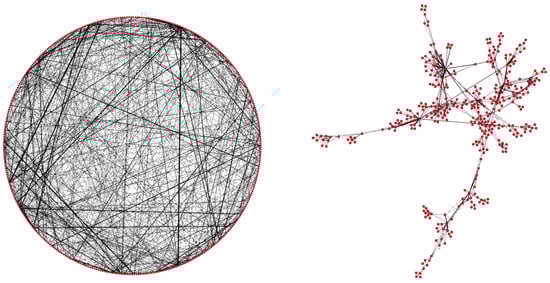 The aim of this short subsection is to draw attention to the features of a good graph drawing. We consider a graph layout to be good if it enables a clear understanding of the structure in the drawing. As an example, let us look at two different methods of visualization on the plane of the same undirected graph (see Figure 1). The most important esthetic criteria for the audience are as follows: drawings should have the minimum number of edge crossings; connected vertices should be close to each other; unconnected vertices should occur far apart; edges should be short, rectilinear, and of similar length; vertices should be evenly spaced; drawings should be symmetrical; and densely connected vertices should appear in clusters. It is clear that the graph layout has an influence on the human perception of a graph’s properties; see, e.g., [13,14,15].