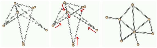 One of the first algorithms used in graph visualization was Eades’ spring-electric algorithm [16]. The basic idea behind this algorithm is that we treat the vertices of a graph as steel rings and replace all of the edges with springs, creating a mechanical system. We then place the vertices in a fixed initial arrangement and release them so that the spring forces between the rings move the arrangement to the state with the minimum energy. Given the coordinates of the nodes and the properties of the springs, this method aims to reduce the total energy of the spring system by changing the positions of the nodes. Figure 2 demonstrates how this method works.