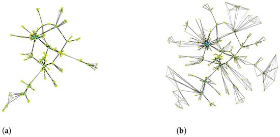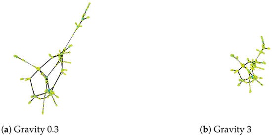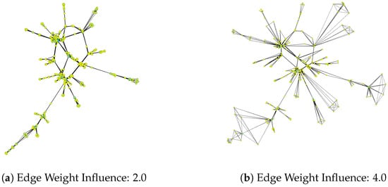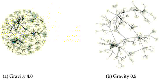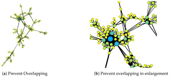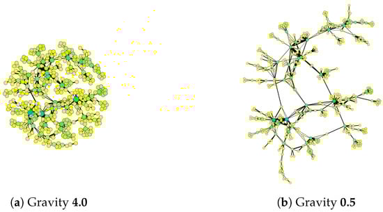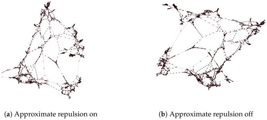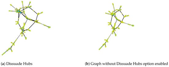 Figure 13a,b were created with the same display field. As can be seen, the option Dissuade Hubs makes the hubs more noticeable, so that we can see the clusters more easily.