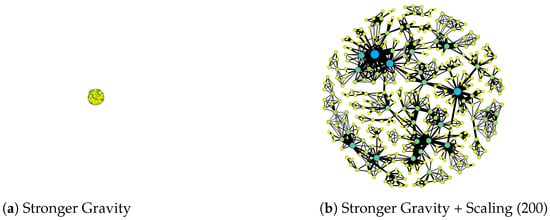 As we can see in Figure 9a, the inclusion of the option Stronger Gravity strongly affects the attraction of the vertices. As a result, it is impossible to see the structure of the graph. Setting the scaling to 200 results in a significant visual improvement, as can be seen in Figure 9b.