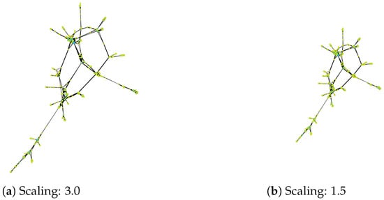 Force-based graph-drawing algorithms use two constants and . The coefficient controls the strength of the attraction forces between vertices, while controls the strength of the repulsion force. Increasing makes the graph smaller, while increasing makes it larger. ForceAtlas2 only uses the parameter, and increasing makes the drawing larger. Scaling affects the visual distance between the vertices (see Figure 10).