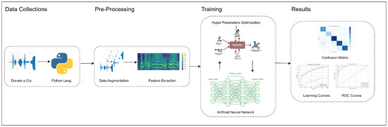 The primary objective of this study is to develop an effective integrated classification system to distinguish different types of baby crying sounds. The proposed method consists of four main phases: data augmentation, feature extraction, hyperparameter tuning, and model training. The overall architecture of the proposed method is illustrated in Figure 3.