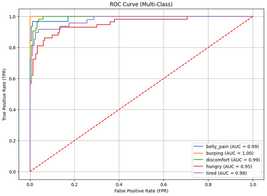 The slight decreases in AUC values, especially for hungry and tired (0.95 and 0.98, respectively), indicate a result consistent with the confusion between these classes. Feature engineering and/or dataset balancing are recommended to separate these classes better.