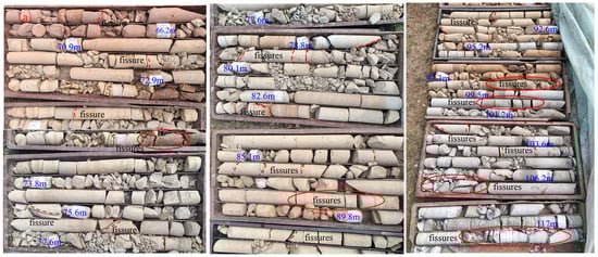 Owing to the impact of gravel within the caving zone caused by 4−2 coal seam mining, the HSD5 borehole’s final drill depth of 117 m falls short of the predetermined depth. The information of fissures provided by field measurement were applied to analyze the characteristics of overburden fissures. During the drilling process of HSD5 borehole, the boring cores of different depths are gradually extracted. The characteristics of fissures developed in the soil layer cannot be noticed because of the mud pollution during the drilling process of borehole. Only the overburden fissures are examined thought analyzing the core of strata. The boring core image is shown in Figure 5a. As shown in Figure 5a, under the effect of coal mining, the boring core is seriously broken and the integrity is poor (RQD = 9~82%, average 48.2%). In addition, overburden fissures are a result of rock fractures brought on by coal seam mining. The top fissures are situated in the medium-grained stone strata with a depth of 63.2 m. With the increase in drilling depth, the more obvious the rock fracture is, the greater the number of overburden fissures. When the drilling core position is close to the coal seam, the degree of core fragmentation indicates that the drilling has reached the caving zone. Thus, according to the boring core image, the top boundary of the caving zone caused by 4−2 coal seam mining is fine sandstone buried at a depth of 73.8 m, and the height of the caving zone is 30.5 m.