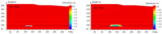 Numerical simulation results of overburden caving are shown in Figure 9. It can be seen that the initial collapse of the immediate roof above the 4−2 coal seam occurs when the 4−2 coal seam is mined for 40 m. Then, with the advancing of the 4−2 coal seam, the collapse of the immediate roof occurs (Figure 9a). When advancing to 70 m of the 4−2 coal seam, the stratum above the immediate roof is fractured and collapses to the goaf. Transverse cracks begin to develop between the collapsed stratum and the uncollapsed rock (Figure 9b). With the 4−2 coal seam excavated to 100 m, the stratum with a large thickness above the immediate roof is fractured. Moreover, the two strata above the stratum with a large thickness caved after it collapse due to the influence of the key stratum (Figure 9c). When the 4−2 coal seam is excavated from 100 m to 200 m, nine periodic weightings of overburden strata occur, and the large-scale subsidence and surface cracks appear on the surface (Figure 9d). After the 4−2 coal seam mining is completed (excavating to 300 m), there are eight periodic weighting in the overburden strata, and the overburden strata steadily stabilized (Figure 9e). According to the analysis results of the process of overburden fracture, there are twenty periodic weighting in the strata throughout the 4−2 coal seam mining process. So, the first periodic interval is 70 m and the periodic weighting interval is 12.7 m. With the mining of 4−2 coal seam, the overburden evolves in a “trapezoidal” fracture pattern, and the fracture angle is 50°~63°, average 57.8°. Moreover, after the completion of the 4−2 coal seam mining, the overburden fissures are connected to the surface cracks, in which it can be inferred that the WCFZ has developed to the surface. Thus, according to the results of numerical simulation, the height of the caving zone is 27.0 m and the height of the WCFZ is 116.5 m.