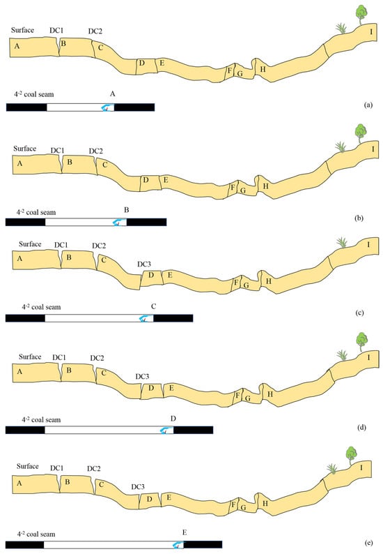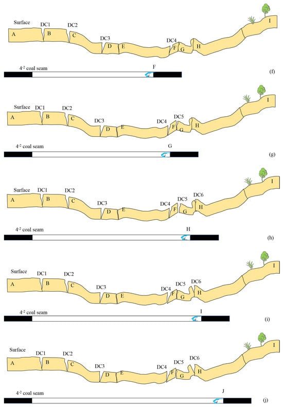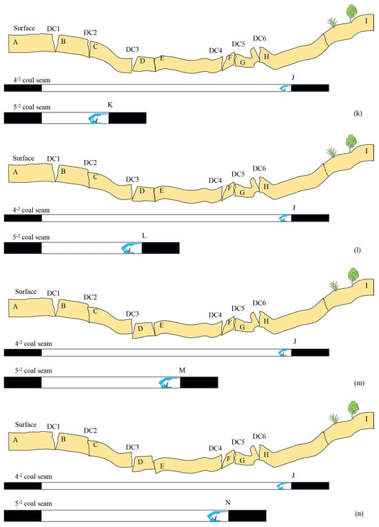 The dynamic evolution process of surface cracks is recreated, and the activity mechanism is clarified, by examining the stability and mobility properties of surface block during coal seam mining. The dynamic evolution process of surface cracks in the 4−2 coal seam and 5−2 coal seam mining is shown in Figure 17. It is evident from the information in Section 4.4.2 that the surface crack DC1 is a boundary crack, which results from block B’s departure along the mining direction of working face under tensile stress. Block B continuously veered in the direction of mining due to the mining of 4−2 coal seam and 5−2 coal seam, which resulted in an increase in the width of surface crack DC1. Previous research results have shown that the blocks above the goaf typically experience deflection cracking and rotation movement with coal seam mining, which is the key to causing the crack width to first expand and then diminish without considering the terrain. The width of crack DC5 developed in the flat area at the top of the slope has experienced two “increase–decrease” shifts as a result of the 4−2 coal seam and 5−2 coal seam mining (Figure 18g–o). The blocks on each side of the valley area’s cracks, however, have additional movement characteristics due to coal seam mining under the terrain effect, which causes the cracks to evolve dynamically in diverse ways. For example, the block C experienced deflection cracking, rotation and vertical sliding with the 4−2 coal seam mining, resulting in an “increase–decrease–increase” in the width of the DC2 crack. Following the mining of the 5−2 coal seam, the block C experiences deflection cracking and rotation, causing the DC2 crack’s width to fluctuate between increasing and reducing. With the mining of the 4−2 and 5−2 coal seams, the block D, which regulates the change in DC3 crack width, has encountered two-degree “deflection cracking–rotating–vertical sliding”. The DC3 crack width changes twice as a result of this repeating motion: “increase–decrease–increase” (Figure 18c–o). Block E regulates the activity of the DC4 crack above the slope. The breadth of the DC4 crack increased steadily as a result of the “deflection cracking–oblique sliding–vertical sliding” movement that occurred in the E block during the mining of the 4−2 coal seam. However, the breadth of the DC4 crack once again changed, first expanding and then decreasing, as a result of the deflection cracking and rotation movement of the E block during the mining of the 5−2 coal seam (Figure 18f–o). Due to the DC6 crack’s dual nature as an in-plane and boundary crack, the block G consistently veered in the direction of open-off cut during the 4−2 coal seam mining period, which caused the crack’s breadth to continuously rise. The DC6 fracture experienced a closure process during the 5−2 coal seam mining period as a result of the H block oblique sliding and the G block deflection (Figure 18h–o).