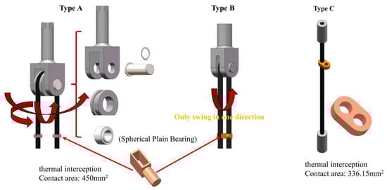 There are three types of tie rod designs that meet the load and length requirements (Figure 1), in which type A and type B are racetrack-shaped designs, and the rod body is wound by parallel T300 long carbon fibers. The arc section diameter of the type A tie rod is larger, and the two ends of the rod body are equipped with metal washers and joint bearings, which make the swing more flexible while occupying more space inside the magnet. The type B tie rod group is compact in structure, but the flexibility is slightly worse. The rod body of the type C tie rod is made of whole CFRP rod material, applying a T300 long carbon fiber parallel arrangement, both ends are connected by epoxy resin adhesive and tension bolt, which is more compact than the type A and B structure. The material parameters involved in the simulation calculation are as close as possible to the materials used in the experiment. In addition, the materials used in the tie rod group include American standard ISI304 stainless steel and T300 carbon fiber in CFRP.