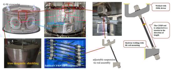 The coils of superconducting magnets are wound by superconducting strips, which can only exhibit superconducting properties at specific low temperatures. It is now common practice to use a tie rod device to suspend the coil module (cold mass) in a vacuum dewar to isolate external heat transfer while using a refrigerator to cool it to superconducting temperatures. It is reported that the traditional low-temperature magnet cooling experiments need to apply coolants, such as liquid nitrogen and liquid neon, and then the temperature could be controlled between 4.2 K and 300 K [8]. The suspension rod not only needs to withstand the gravity of the cold mass, but also needs to ensure the relative geometric position accuracy of the cold mass inside the magnet under different working conditions, so the rod must have a high tensile strength. One end of the tie rod is connected to the vacuum dewar of 300 K, and the other end is connected to the cold mass of the 4 K temperature zone, which becomes the main path of heat conduction and heat leakage. In view of the limited power of the chiller, it is necessary to minimize the thermal conductivity of the tie rod.