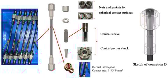 In order to solve the problems of high processing cost, long cycles and unstable quality, this study designed the type D adjustable tie rod (Figure 2) and successfully applied it to the assembly and manufacturing of magnets. The core of the design of the adjustable tie rod structure is the special clamping device at both ends of the CFRP rod body and the standardized CFRP branch rod. As shown in Figure 3, the clamping device at both ends of the CFRP rod body consists of a chuck made of 304 material and a conical sleeve. The shape of the chuck matches the taper of the sleeve, which creates a self-locking effect through the conical structure, ensuring a firm clamping of the CFRP rod body. When the chuck is pressed into the conical sleeve, the chuck is radially compressed due to the taper action, so as to tightly clamp the branch rod. The inside of the chuck distributes a plurality of through holes evenly along the circumference so as to hold a plurality of branches simultaneously. The outer surface of the sleeve is provided with a thread, and the end is provided with a square wrench clamp. The T300 filament tow carbon fiber used in the CFRP branch rods is supplied by Weihai Guangwei Carbon Fiber Co., LTD., and processed in batches by China National Carbon Corporation’s plant. The carbon fiber is arranged in parallel along the axis to make a standardized slender rod with a diameter of 2 mm and a length of 1000 mm for subsequent use.