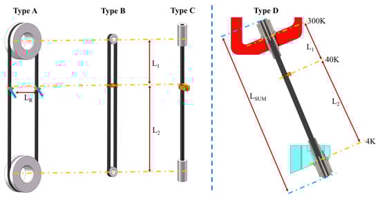 At present, high-strength materials such as titanium alloy [9], glass fiber resin composite material (GFRP) [10] and carbon fiber resin reinforced composite material (CFRP) [11] are used to make slender rods, and the structural forms include cylinder shape, runway shape and sheet shape. In particular, titanium alloys have shown low heat conduction properties [12,13,14]. For example, CFRP materials are often used in MRI magnets to make a strip bar [15] or a cylindrical bar [16] with a cross-section of runway shape to fix the support main coil and shield coil. Compact muon solenoid (CMS) uses a titanium alloy cylinder to fix 225 tons of cold mass in a superconducting magnet [17]. The 8300 tons of cold mass was fixed with a titanium alloy cylinder in a superconducting ring cyclotron [18]. Muon ionization cooling experiment (MICE) magnets use CFRP material to make a two-stage, racetrack-shaped strip rod body to hold the superconducting coil [19]. In high-temperature superconducting motors, GFRP is used to make a strip tie rod with a runway cross-section to support the fixed rotor [20].