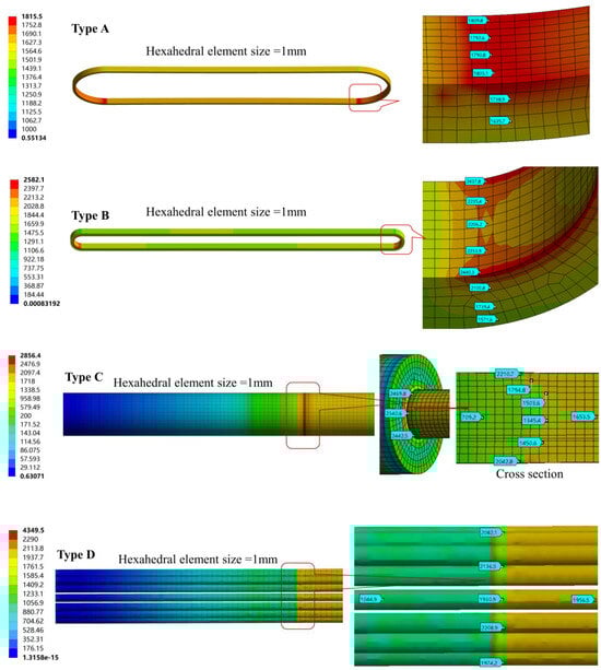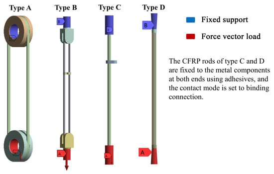 As shown in Figure 6, types A, B, C and D models are all analyzed by finite element method. In type A, the annular CFRP rod body and metal washers are modeled with frictional contact at 0.1. Mesh sizes are 3 mm for washers and 1 mm for CFRP. A fixed support and 147 kN tensile load are applied to the upper and lower washers, respectively. Then, in type B, the assembly model consolidates metal components into one entity, with frictional contact at 0.1. Mesh sizes are 3 mm for metal (Y-shaped bolts) and 1 mm for CFRP. A fixed support and 147 kN force are applied to the upper and lower Y-shaped bolts, respectively, parallel to the rod’s length.