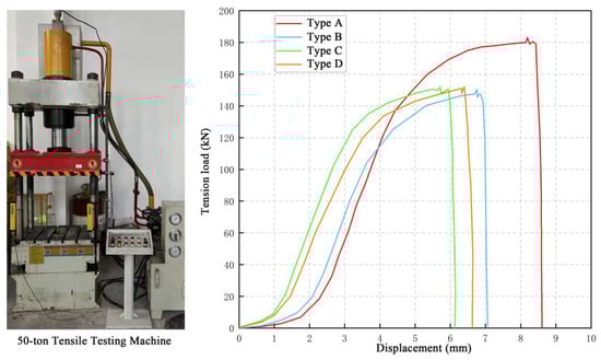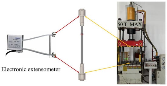The content of tensile experiments could be divided into two parts, including the ultimate tensile load and the relationship between tensile load, and then the shape variables of the four structures are measured. As for the tensile experiment equipment, a hydraulic universal testing machine, shown in Figure 7, was applied with a rated maximum load of 500 kN. Meanwhile, a high-precision electronic extensometer (WDW-20) was applied as well. The extensometer and the tension nuts were fixed at both ends of the rods.