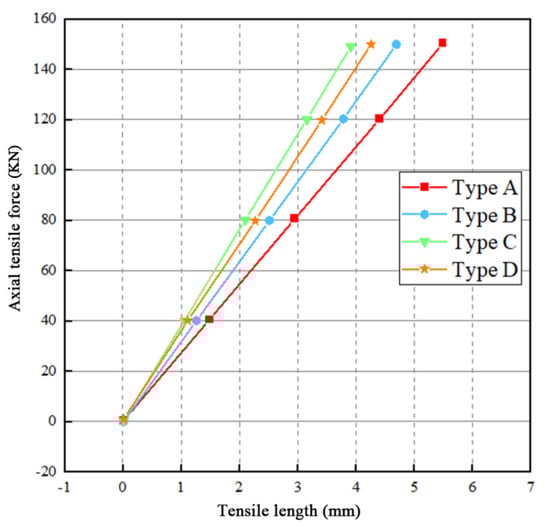 Additionally, according to the statistical analysis of the tensile test data of four types of tie rods, the average maximum tensile load of type A is 180.39 kN, which is significantly higher than that of other types (type B: 144.74 kN, type C: 148.23 kN, type D: 147.59 kN). The standard deviation of type A is 1.89 kN and the dispersion coefficient is 1.05%, indicating that the data distribution of type A is relatively concentrated and the differences between individuals are small. Type B, on the other hand, has a standard deviation of 0.92 kN and a dispersion coefficient of 0.64%, and, although the data distribution is more concentrated, its average load is lower. The standard deviations of type C and type D are 1.07 kN and 0.54 kN, respectively, and the discrete coefficients are 0.72% and 0.37%, respectively, indicating good performance stability. In terms of unit area load, type A has the largest unit cross-sectional area load, reaching 2.00 kN/mm2, followed by type D (1.96 kN/mm2) and type C (1.89 kN/mm2) and type B has the lowest load (1.61 kN/mm2). In summary, type A not only has the highest load capacity, but also small differences between individuals and stable performance, while the type D unit cross-sectional area load is very close to type A, and has good flexible adjustment ability.