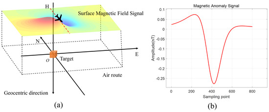 Magnetic survey map: (a) schematic of magnetic anomaly detection; (b) magnetic anomaly signal.