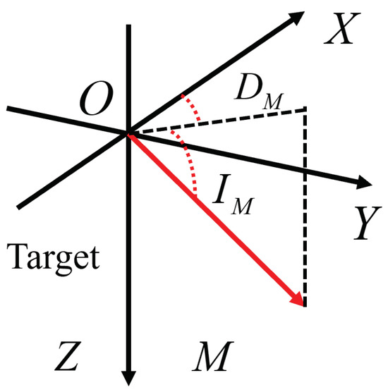 As discussed earlier, the magnetic anomaly field is determined by both the geomagnetic field vector and the target magnetic field. To offer a clearer explanation of the magnetic moment angular characteristics, we will now describe the associated angular parameters. According to Figure 3, the angle formed between the magnetic moment and its projection onto the XY plane is defined as the inclination angle, denoted as . Meanwhile, the angle between the projection of the magnetic moment onto the XY plane and the X-axis is defined as the declination angle, denoted as .