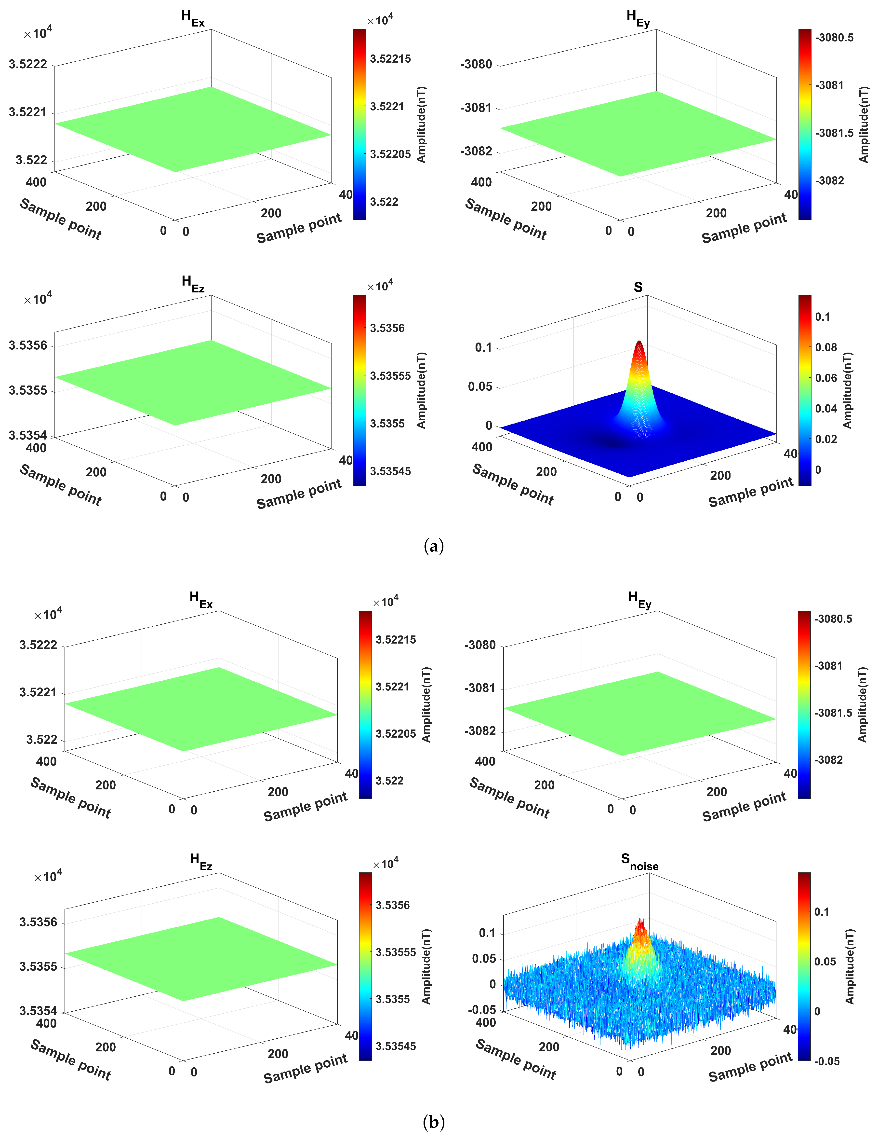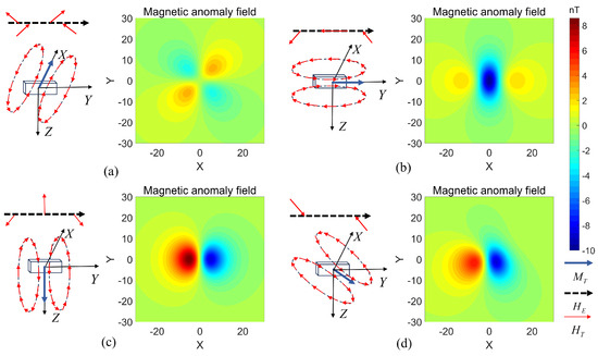 Assume that the direction of the geomagnetic field is parallel to the Y-axis, the target is located at , and the observation range spans from to 30 along both axes, with a sampling point interval of . The observation plane is set at , and the directions of the total magnetic moment vector are , , , and . The magnetic field intensity is provided in nanoteslas (nT).