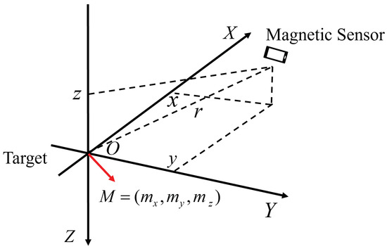 Relying on the condition that the magnetic target can be equivalently represented as a magnetic dipole, the magnetic anomaly signal is derived using the magnetic dipole model. A coordinate system is established according to Figure 5, with the magnetic target placed at the origin. The coordinates of the magnetic field sensor are denoted as , and the distance between the magnetic field sensor and the magnetic target is r. The magnetic target is equivalently represented as a magnetic dipole with a magnetic moment . The expression for the magnetic anomaly signal is given as follows: