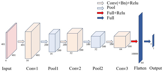 The structure of the CNN model proposed in this paper is illustrated in Figure 6 composed of three convolutional layers, two pooling layers, and one fully connected layer, with the detailed settings provided in Table 1. The convolution kernel, compared to larger kernels like , incurs lower computational cost while achieving a larger receptive field through the stacking of multiple kernels. The design of the three convolution layers aims to progressively extract features from low order to high order, striking a balance between feature extraction and computational efficiency. As the number of convolutional layers increases, the receptive field expands, enhancing the network’s ability to capture local features [29]. The network also includes two pooling layers, which downsample the convolutional data to reduce computational complexity and improve the model’s generalization ability. The network achieves a lightweight design while maintaining strong predictive performance.