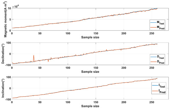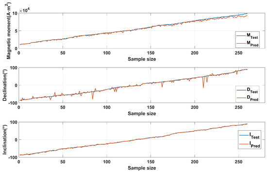 As in previous sections, and represent the true values of the magnetic moment deflection and inclination, while and represent the predicted values of these parameters.