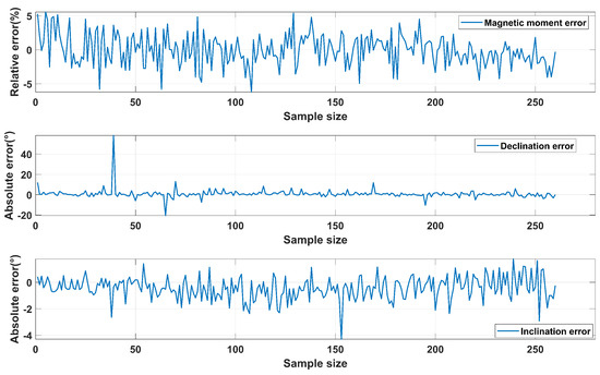 When the inclination angle of the test magnetic moment is close to 90°, small changes in the X and Y components of the magnetic moment can cause significant variations in the magnetic moment deflection, leading to drastic fluctuations in the deflection error. In contrast, the magnetic moment inclination changes less drastically during the calculation process, so the magnetic moment inclination error is smaller than the magnetic moment deflection error.