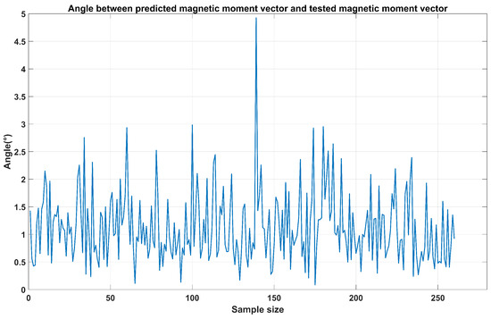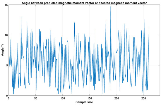 Seventy percent of the dataset is used for training the network. It is important to note that the selection of the training set is random. The following are the test results after the model training is completed. The test results show that the error in the magnetic moment modulus is 1.85%, and the average absolute errors for the magnetic moment deflection and inclination are and , respectively. The average absolute error between the predicted magnetic moment and the test ranging angle is approximately , the results are shown in Table 3. The model is demonstrated to possess a strong magnetic moment fitting capability, effectively capturing the underlying relationship between the input data and the target magnetic moment. This capability allows the model to achieve highly accurate predictions on the test set, maintaining a relatively small error margin.