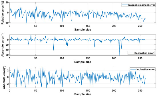 Fitting errors of the magnetic moment magnitude, declination, and inclination under noise conditions with SNR = −5 dB.