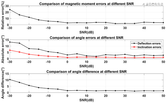 From Figure 14 and Figure 15, it can be observed that as the SNR increases, the error generally decreases and eventually stabilizes. When the SNR = dB, the errors in the three components of the magnetic moment are approximately 7%. The relative error in the magnetic moment magnitude is 4.92%, while the absolute errors in the magnetic moment declination and inclination are and , respectively. The vector angle difference is .