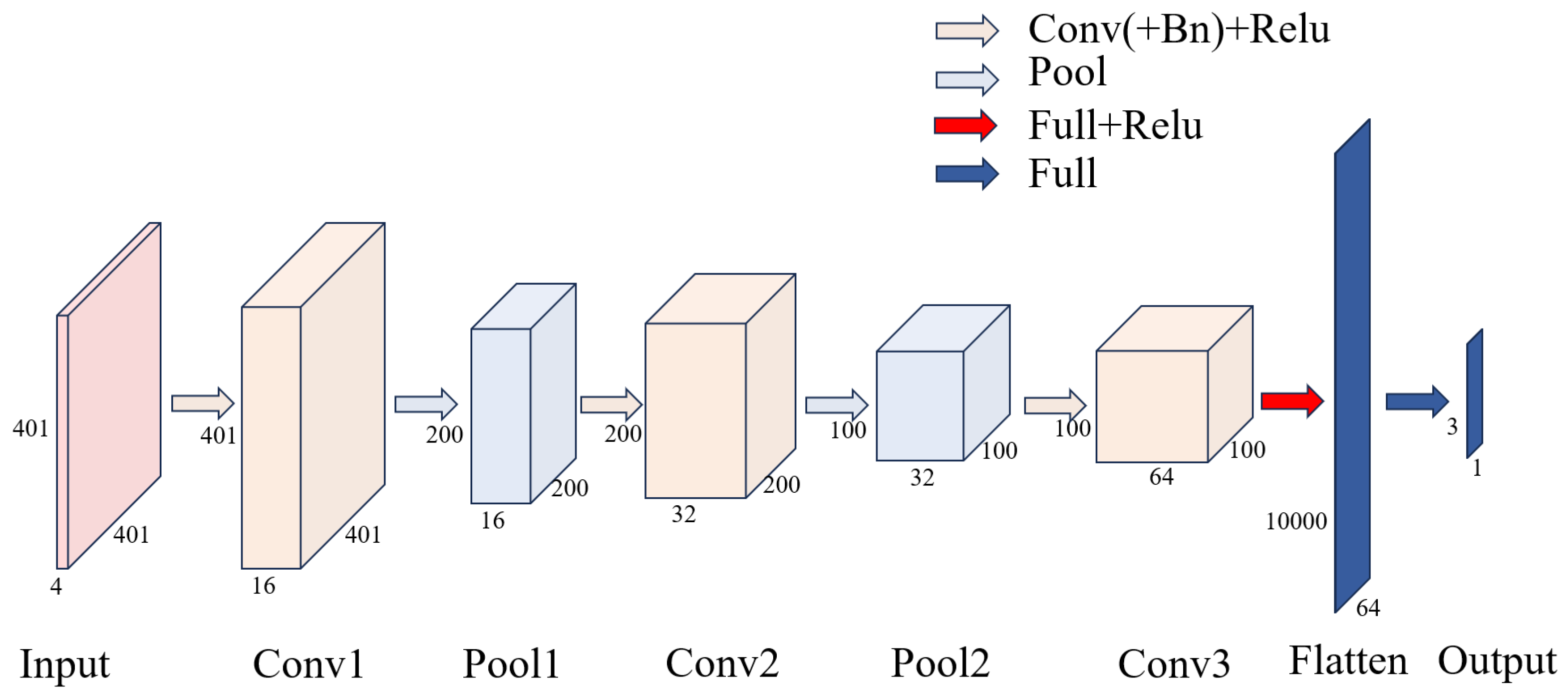 The 2D CNN proposed in this paper uses the three components of the geomagnetic field and the scalar magnetic anomaly signal as input samples. The network consists of three convolutional layers designed to extract feature information from the input samples, with the labels corresponding to the components of the target magnetic moment.