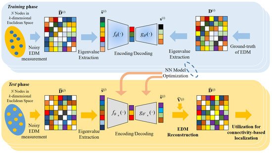 In this paper, we propose a novel denoiser for a noisy EDM, referred to as DAE-EDMR (Readers can understand our framework more easily by referring to Figure 1. Our method is based on the mathematical fact that the EDM measured from N nodes in a k-dimensional space must have a rank of at most . Abstractly, this implies that N-choose-2 pairwise distances can be rearranged into a k-dimensional structure. Consequently, if the pairwise distances are not accurately measured, reconstructing these segments would require embedding them into a higher-dimensional space. Using this concept, we optimize the NN model for EDM denoising by utilizing the eigenvalues to capture how the nodes are volumetrically distributed. A detailed explanation is given in Section 2), which leverages a denoising autoencoder (DAE). To increase the efficiency of the NN operations, we exploit the low-rank property of the EDM, which is bounded to only a number of eigenvalues, where k is the dimension of the Euclidean space, independent of the number of sensor nodes [23]. Leveraging this valuable mathematical observation, we design our NN model by inputting and outputting vectors of the eigenvalues of the noisy and original EDMs, respectively. Through these inputting/outputting rules, the proposed scheme achieves remarkable denoising results, even with a relatively small training dataset. The efficiency of the proposed denoiser is attributed to the utilization of the low-rank property of the EDM, which helps the NN model to establish better inference with limited training data. In fact, the combination of the DAE and EDM is highly attractive due to the complementary features of these two techniques. On the one hand, the DAE is a powerful NN framework for manifold learning, which enables it to effectively capture intricate data patterns and facilitate efficient denoising. On the other hand, the EDM exhibits an extremely-low-rank property, contributing to the dimensionality reduction. Regarding the online complexity, the proposed method requires eigenvalue decomposition (EVD) of the EDM as a pre-processing step for the NN operations.