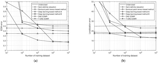In this section, we analyze the effect of DAE-EDMR and T-DAE-EDMR from various perspectives. We compare the performance of our proposed methods with that of the conventional algorithms, which are semi-definite relaxation [16], the nonlocal patch tensor-based method [18], and conventional NN-based methods referred to as deep-learning-based methods A [19] and B [22]. We also provide the result for the undenoised EDM to show the denoising performance of each algorithm. Overall, we will demonstrate the effectiveness of each scheme in denoising the noisy EDM and assess its impact on the localization performance.