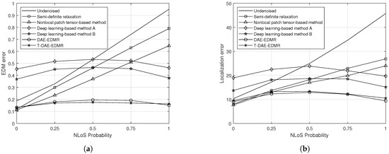 Figure 3 illustrates the impact of the NLoS probability on the EDM and localization errors. It is assumed that the NLoS probability follows a Bernoulli distribution. As the NLoS probability increases, the error for distance measurements naturally increases, resulting in a worse localization performance. Therefore, the non-NN-based techniques are in line with this general situation. On the other hand, a different phenomenon appears from the information-theoretic perspective. In the NN-based methods, i.e., deep-learning-based methods A and B, DAE-EDMR, and T-DAE-EDMR, the EDM error takes the form of a concave function for the NLoS probability. This is related to the fact that the variance in and the entropy of are and , respectively, which are in the form of concave functions. Interestingly, our proposed methods show a superior localization performance in the extreme case where the NLoS probability is 1 and can therefore be effectively applied in environments where NLoS conditions occur frequently. For future work, an interesting denoising task may involve modeling the distance measurement error due to NLoS conditions as a joint random variable, considering both the event occurrence and distance biasing. This approach could provide valuable insights into further enhancing the denoising techniques in the presence of errors due to NLoS conditions.