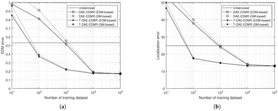 Performance comparison according to the number of training datasets. (a) NMSE between ground-truth and denoised EDMs and (b) localization error in meters.