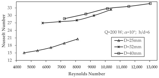 Between h/d = 6 and h/d = 8, for a nozzle diameter of 25 mm, the Nu decreased by 16.3% for the minimum velocity and by 14.5% for the maximum velocity. For a nozzle diameter of 32 mm, decreases of 14.5% and 11% were observed for the minimum and maximum velocities, respectively. For a nozzle diameter of 40 mm, the Nu decreased by 5.9% for the minimum velocity and by 9.2% for the maximum velocity.