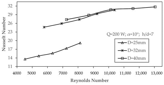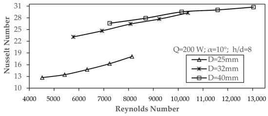 The experimental results for a constant heat flux of 200 W and an inclined heat sink at an angle of 10° with a height-to-diameter ratio of eight indicated that heat transfer enhanced with the increasing fluid velocity and nozzle diameter. For h/d = 8, with a nozzle diameter of D = 25 mm, the Nu showed an increase of 5.9–11.4% between consecutive velocity increments and a total increase of 42.6% between the minimum and maximum velocities. For D = 32 mm, the increases ranged from 4.7% to 7.2% between consecutive velocities and 26.6% between the minimum and maximum velocities. Finally, for D = 40 mm, the increments were between 1.8% and 5.8% for consecutive velocities, with a total increase of 15.7% between the minimum and maximum velocities.