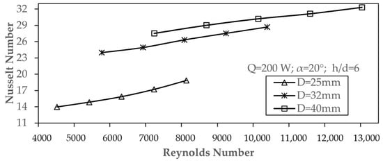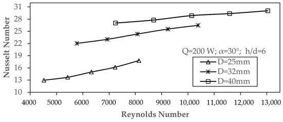 The Nu for the rectangular finned heat sink inclined at 30° increased with the Re. An increase in nozzle diameter and jet air velocity led to a rise in the Nu. Conversely, the Nu increased with a decreasing dimensionless h/d distance, and the relationship was predominantly linear. The variation in the Nu with the Re for different dimensionless distances (h/d = 6, 7, and 8) is presented in Figure 9, Figure 10 and Figure 11.