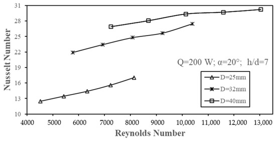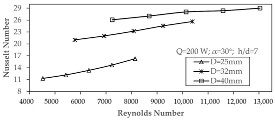 For the dimensionless distances of h/d = 7 and h/d = 8, with a nozzle diameter of 25 mm, the Nu decreased by 6.4% and 5.7% for the minimum and maximum velocities, respectively. For a nozzle diameter of 32 mm, decreases of 6.4% and 7% were observed for the minimum and maximum velocities, respectively. With a nozzle diameter of 40 mm, the Nu decreased by 3.5% for the minimum velocity and by 2.9% for the maximum velocity.