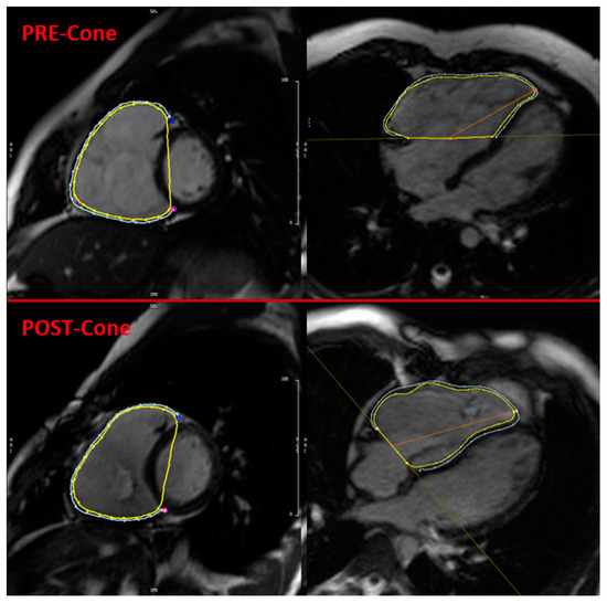 Regarding CMR-FT, there was a significant decrease in GLS after Cone repair (−15.01% vs. −14.53%, p = 0.0155), while significant improvements were noted in GRS and GCS (15.00% vs. 17.83%, p = 0.0202 and −8.82% vs. −13.02%, p = 0.0026), as illustrated in Figure 2.