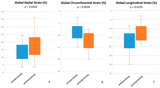 Global radial (a), global circumferential (b), and global longitudinal strain (c) before and after Cone repair. The line in the middle of the boxplot represents the median; the X represents the mean.