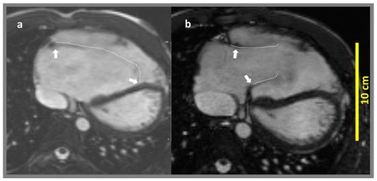 - Alfakih, K.; Plein, S.; Bloomer, T.; Jones, T.; Ridgway, J.; Sivananthan, M. Comparison of right ventricular volume measurements between axial and short axis orientation using steady-state free precession magnetic resonance imaging. J. Magn. Reson. Imaging 2003, 18, 25–32. [Google Scholar] [CrossRef]