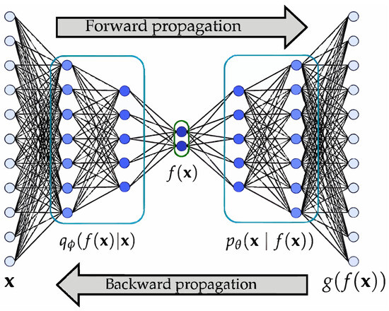 A Variational AutoEncoder extends a standard AutoEncoder by employing a regularized latent space based on principles of probabilistic Machine Learning. Instead of encoding an input as a single point, the encoder receives the input as a distribution characterized by its mean () and standard deviation (), from which a sample is drawn, , and subsequently decoded. The decoder receives the latent variables and the probabilistic density function provides the matrices containing the mean and covariance of the model . The weights need to be learned by the ANN so that it can configure a loss function and generate both the latent space and the output. As shown in Equation (4), the loss function combines a reconstruction term, , and a Kullback–Leibler (KL) divergence term . This regularization component organizes the latent space by aligning it with a standard normal distribution. Similar to the SAE, in this work, the VAE models also incorporate MSE as their loss function for comparative reasons. Figure 2 shows the structure of a general VAE network.