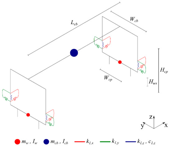 Graphical representation of the numerical model of the railway vehicle considered (Guedes et al. (2023) [2]).