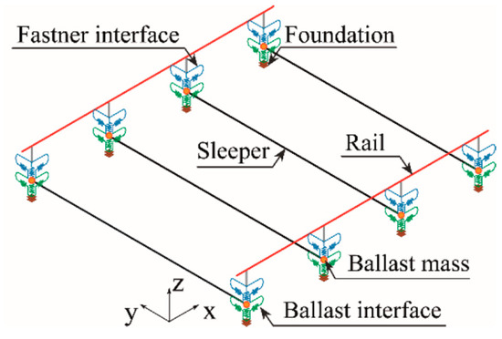 Figure 6 illustrates the discretization of the model, where the rails and sleepers are modeled using beam elements with appropriate properties. The interfaces, such as ballast and pads/fasteners below and above the sleepers, are considered using spring and pressure point elements in all three directions. Finally, the foundation properties were considered by a simplified approach based on a Winkler model (presented in detail in Mosleh et al. (2020) [49]). The 3D ballast track numerical model is validated with modal parameters as presented in Ribeiro et al. (2021) [50]. The material and geometric parameters considered in the simulation are detailed in Table 3.