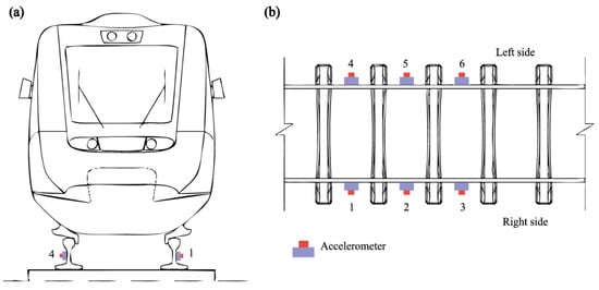Virtual wayside monitoring system with accelerometers positioned mid-span between sleepers: (a) back view; (b) top view. (Adapted from Magalhães et al. (2024) [3].)