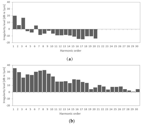 The measurement data used to characterize the wheel profiles were obtained from two main sources: (i) Johansson et al. (2005) [63] provided data for intact polygonal wheels (Damage 1), with a wavelength spectrum extending across 20 harmonics, ranging from 0.135 to 2.7 m (Figure 9a); (ii) Cai et al. (2019) [64] provided data for polygonal wheels with damage (Damage 2), where the first 30 harmonics were considered. For these latter data, the sixth to eighth harmonic orders were predominant, indicating a specific wear pattern.