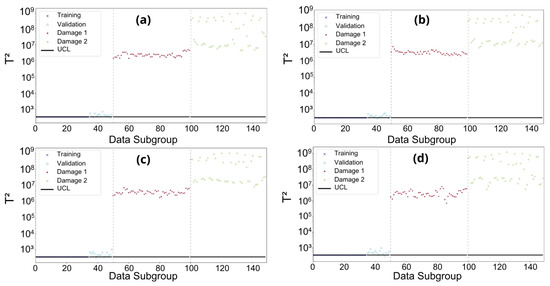 Thus, values above the UCL indicate significant changes in the data, suggesting the presence of structural damage or other irregularities. This approach allows for continuous monitoring of the structure’s condition and the implementation of corrective actions before catastrophic failures occur. It is important to emphasize that, by definition, 5% of the values from the training data will exceed the UCL, which is not a cause for concern if they remain close to the threshold [27,37].