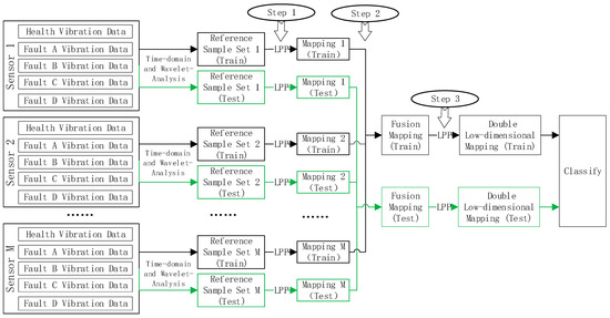 The flowchart of the proposed method is depicted in Figure 2, illustrating the three main steps in the feature extraction process. The first step involves dimensionality reduction of a multi-state sample set from a single sensor using locality-preserving projections (LPP). In the second step, mappings from multiple sensors are integrated to achieve fusion mapping. These separate mappings are derived individually from two-class models using LPP, with the goal of capturing and preserving local distinctions between each fault state and the normal state.